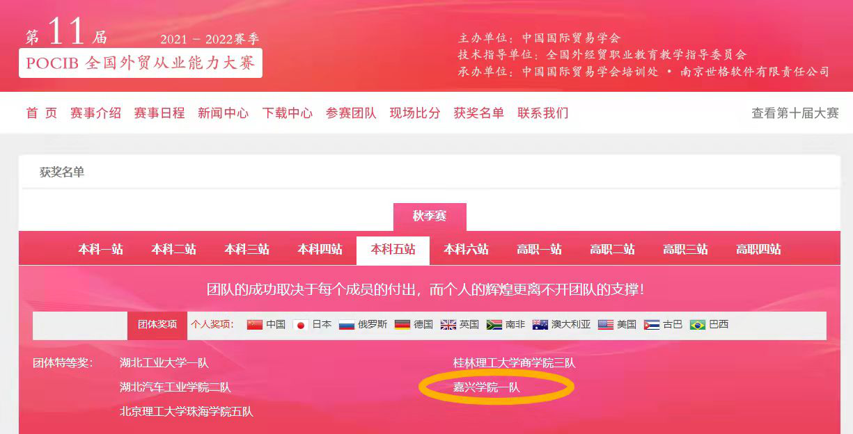 11月4日,第十一届POCIB全国大学生外贸从业能力大赛(以下简称POCIB大赛)秋季赛落下帷幕。由19名国经专业和1名商务英语专业学生组成的我校两支参赛队在李亚、王琨两位指导老师的指导下,力克群雄,斩获2项团体特等奖,并喜获20项个人奖,个人获奖率达100%。这是我校参赛以来获得的最好成绩,取得了历史性突破。其中: