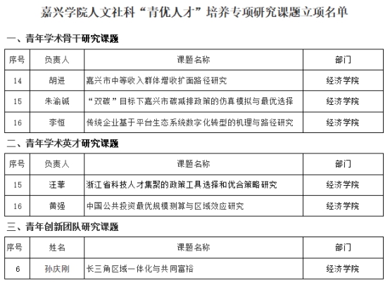 据学校人文社科处网站《关于公布第一期嘉兴学院人文社科“青优人才”专项研究课题的通知》,本期“青优人才”专项研究课题拟立项38项,其中青年学术骨干专项研究课题16项,青年学术英才专项课题16项,青年创新团队课题6项。我院胡进、朱渝铖、李恒3位老师立项学术骨干研究课题,汪菲、黄强2位老师立项学术英才研究课题,孙庆刚老师立项创新团队研究课题。