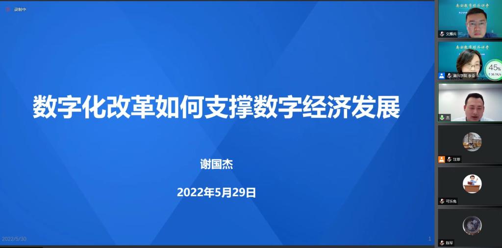 5月30日晚,嘉兴学院太阳成集团tyc122ccvip、嘉兴市经济学会、嘉兴市高层次人才联谊会以线上会议形式联合举办第1期“南湖数字经济讲堂”。数字浙江技术运营有限公司项目总监、解决方案架构师、省重点实验室方向负责人谢国杰先生应邀作学术报告,太阳成集团tyc122ccvip副院长李亚主持,我校多名师生参与了线上研讨。