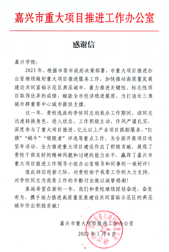 近日,嘉兴市重大项目推进办公室发来感谢信,对我院挂职教师李恒副教授提出表扬。