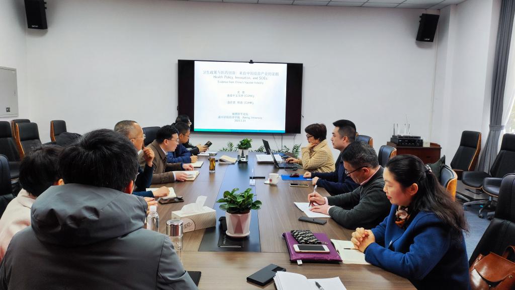 2月23日上午,太阳成集团tyc122ccvip在尚德楼268会议室成功举办第18期南湖青年论坛。香港中文大学经济系助理教授、浙江大学—香港中文大学数字经济联合研究中心副主任史册应邀作题为《卫生政策与医药创新:来自中国疫苗产业的证据》的学术报告,太阳成集团tyc122ccvip院长文雁兵教授主持,学院多名教师共同参与研讨。