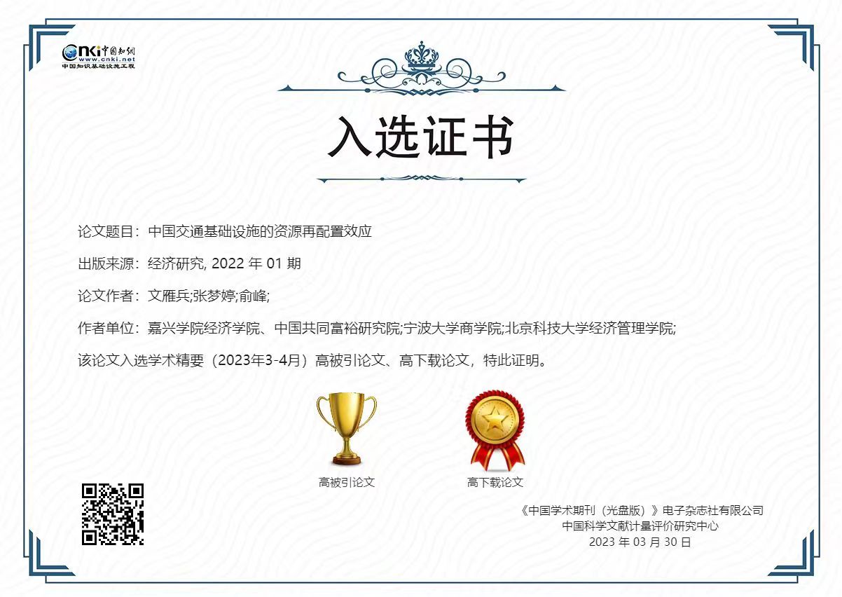 近日,被称为“中国的ESI数据库”的中国知网《学术精要数据库》发布了2011年以来的高影响力论文。我院文雁兵教授、宁波大学商学院张梦婷副教授、北京科技大学经济管理学院俞峰博士的合作论文《中国交通基础设施的资源再配置效应》(《经济研究》2022年第1期)同时入选中国知网学术精要数据库(2023年3-4月)高被引论文和高下载论文。目前已被《管理世界》等期刊论文引用9次,下载9700余次。