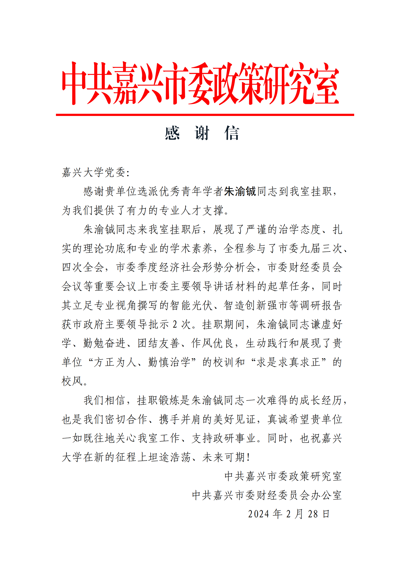近日,中共嘉兴市委政策研究室发来感谢信,对我院挂职教师朱渝铖博士提出表扬。