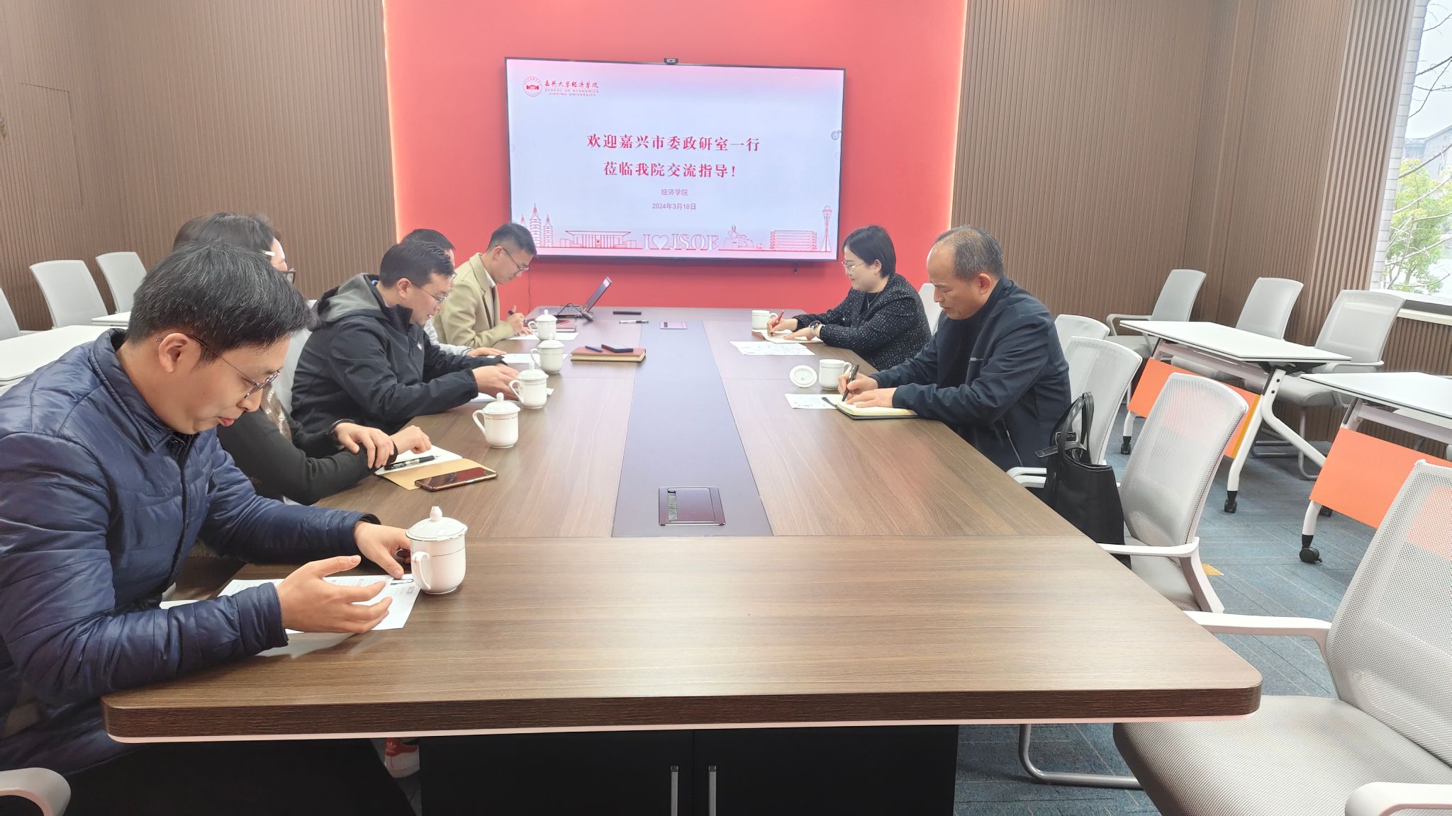 3月18日下午,嘉兴市委政研室副主任陆金泉、嘉兴市委政研室人事秘书处处长金丽赟一行到访我院,双方围绕优秀人才挂职锻炼、科学研究合作、重点项目攻关等开展座谈。院长文雁兵,副院长孙庆刚,近年来赴市委政研室挂职锻炼青年教师胡进、朱渝铖、郭红霞参加座谈交流。