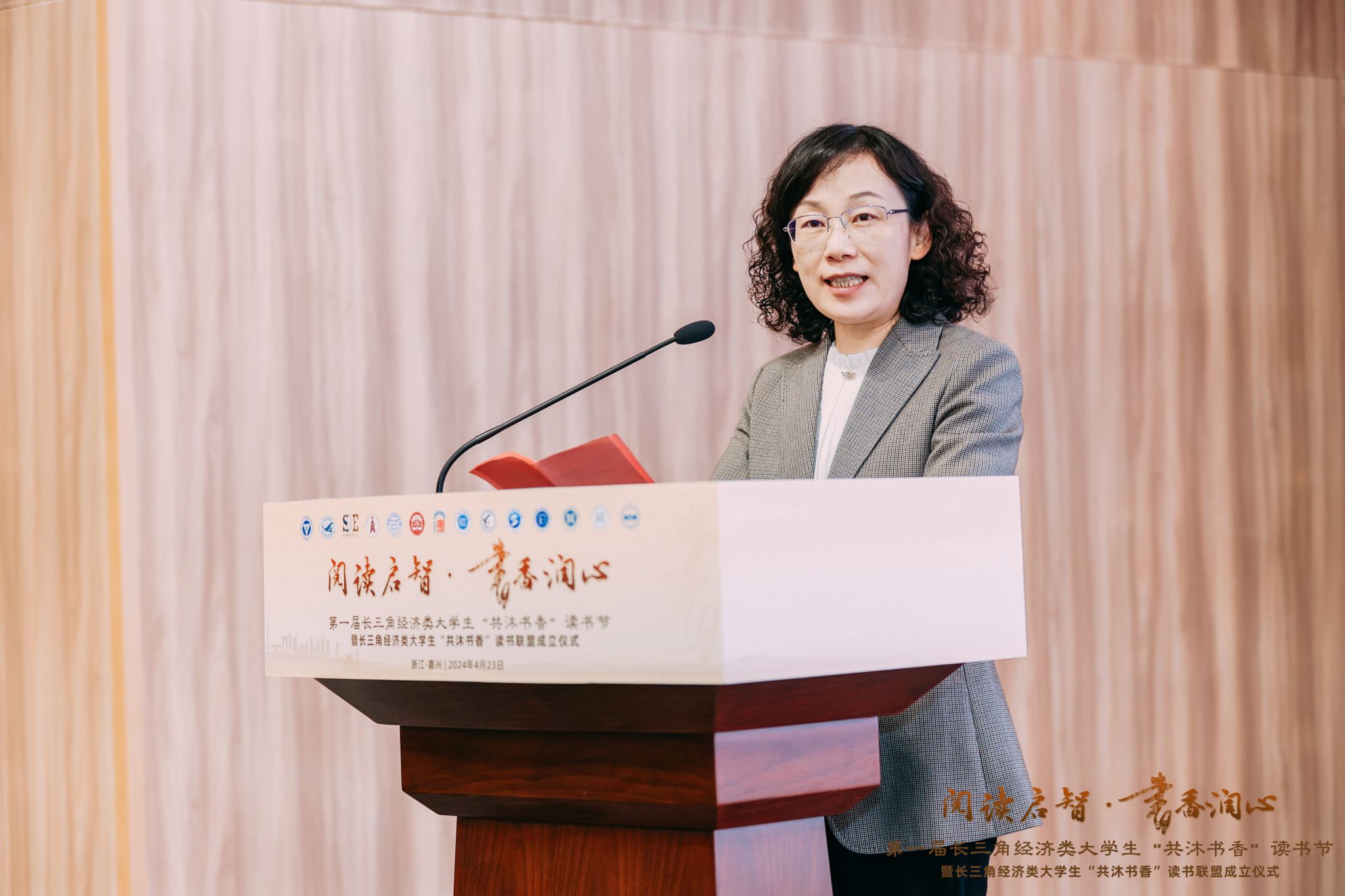 张琦副校长代表学校致辞,对与会嘉宾表示热烈欢迎,并介绍了122cc太阳成集团的历史沿革和办学特色。她表示,读书在122cc太阳成集团是一种生活方式,更是一种精神追求。学校不断创新和探索有校园特色的阅读活动,太阳成集团tyc122ccvip从2002年开始陆续开展了“原典阅读”“读书小组经典阅读”等活动,将“百篇经典阅读”品牌活动逐步在全校范围内宣传和推广,通过第一、二、三课堂联动发力,构建了全科覆盖、类型丰富、相互支撑的经典阅读教育课程和阅读体系。在深入推进长三角一体化发展国家战略背景下,首批来自长三角“三省一市”共计14所高校经济类院共同发起成立经济类大学生“共沐书香”读书联盟,专家学者、青年才俊、蓬勃学子齐聚一堂,交流互鉴、以读会友,共同进步,不仅是长三角一体化国家战略的积极落实,还是立德树人根本任务和三全育人教育教学要求的贯彻落实,更是共同培养堪当民族复兴重任时代新人的创新之举。希望联盟单位师生能以读书节为纽带,以书香长三角校园文化建设促进文化强国建设,为奋进新征程、建功新时代注入强大精神力量。