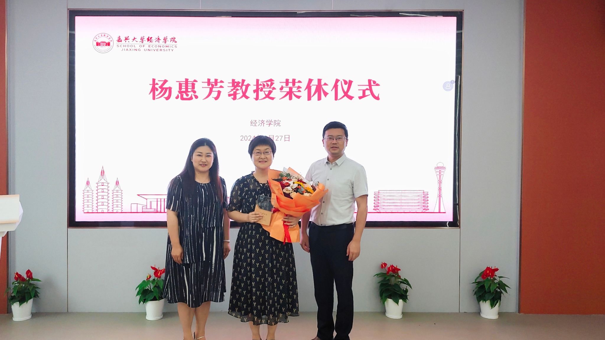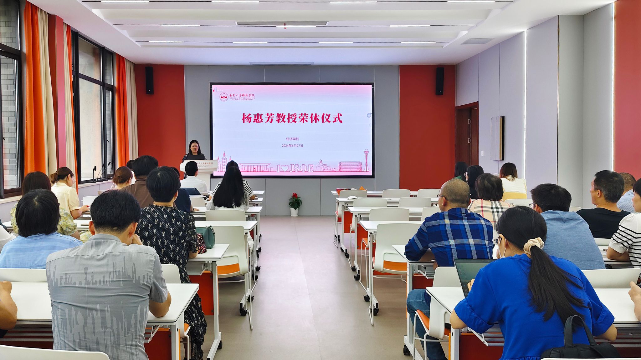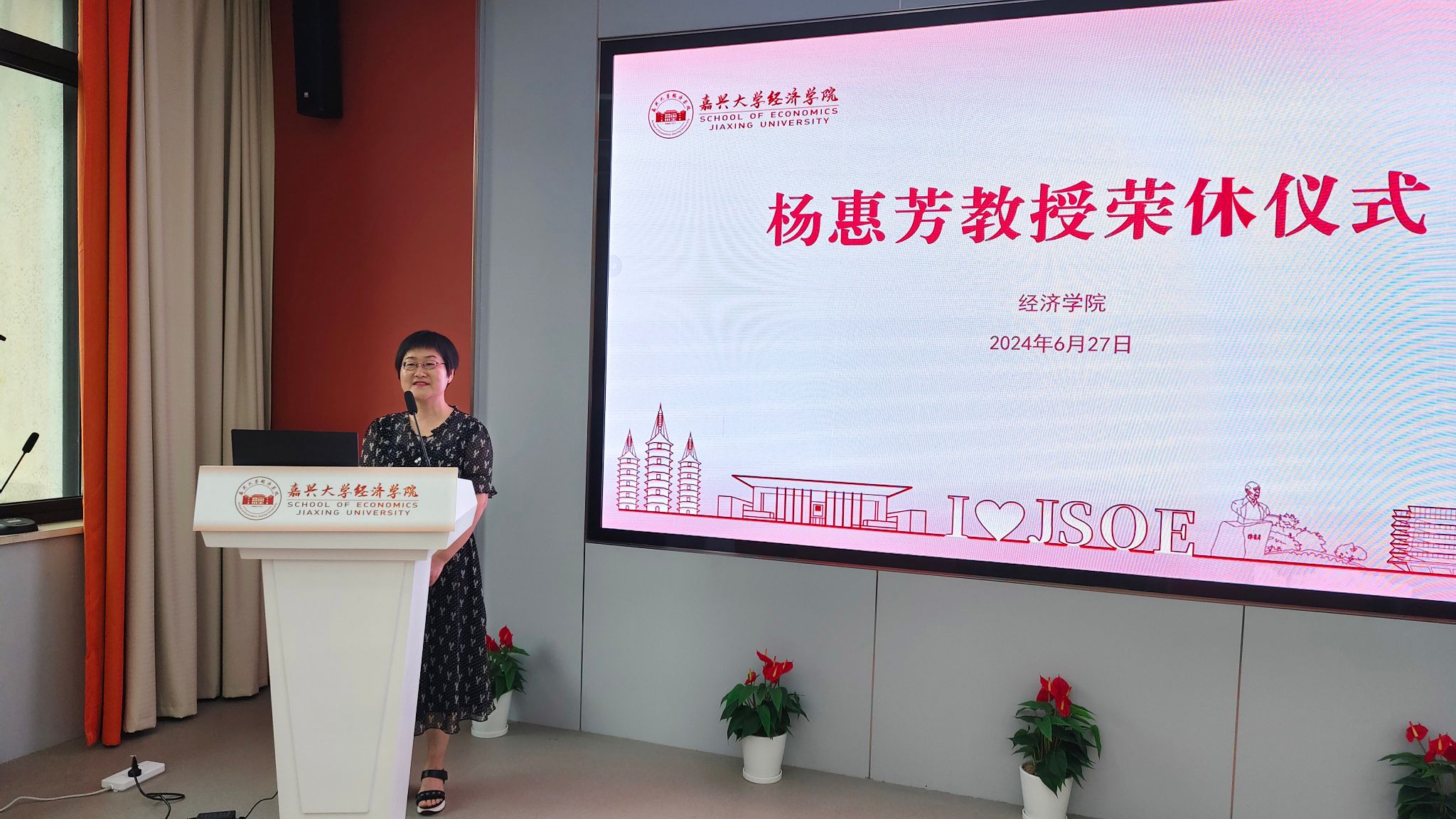 学院党委书记蔡运男深情回顾了杨惠芳教授30余年坚守三尺讲台的点点滴滴。杨惠芳教授1992年从江西财经学院(今江西财经大学)毕业来学校工作,一直从事金融类教学科研相关工作,2004年聘为副教授,2018年晋升为教授,主持省部级课题3项,市厅级课题8项,发表中文一级论文8篇、二级论文20余篇,撰写的多份经济咨询研究报告获得嘉兴市主要领导肯定性批示,指导学生获得省级以上竞赛荣誉十余项。曾先后荣获优秀班主任、优秀教师、九三学社优秀社员等众多荣誉或称号。在所授学生心中,她是一位善解人意、和蔼可亲的好老师;在年轻老师心里,她是一位知心大姐、优秀前辈;在学院同事眼中,她是一位乐于助人、团结友爱的好朋友;在学院历任班子评价中,她是一位爱岗敬业、勇于担当、业绩优秀的好榜样!