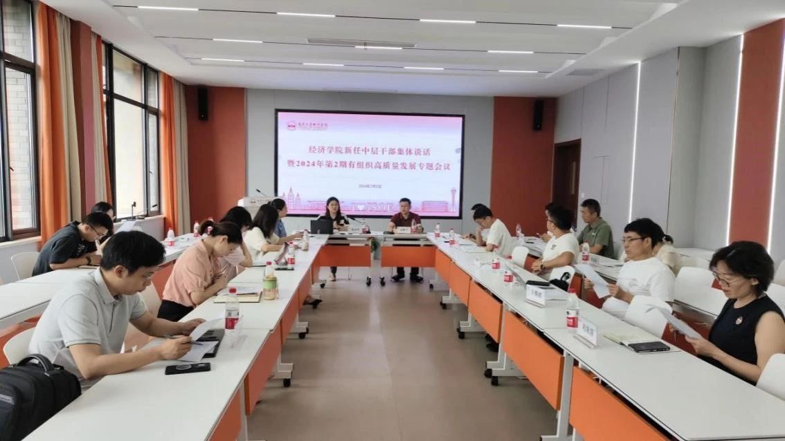 为落实“新经院战略”,推进“四新体系”建设,扎实推进有组织高质量发展,7月2日上午,我院举行新任中层干部集体谈话暨2024年第2期有组织高质量发展专题会议。学院党政领导班子成员、党委委员、各系(中心)及三办主任、支部书记参会。