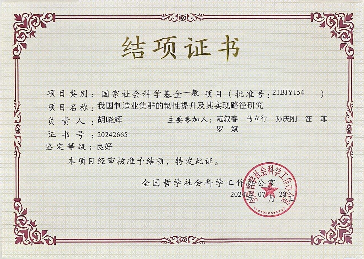 近日,我院胡晓辉副教授主持的国家社科基金一般项目“我国制造业集群的韧性提升及其实现路径研究”通过结项验收审批,鉴定等级良好。