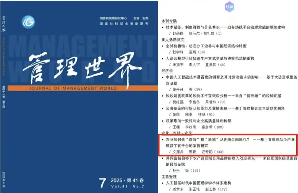 近日,我院文雁兵教授、周艳副教授与汪寿阳教授(中国科学院大学经济与管理学院、上海科技大学创业与管理学院)合作论文《农业如何借“数智”提“新质”从传统走向现代?——基于青莲食品全产业链数字化平台的案例研究》在权威期刊《管理世界》2025年7月刊正式发表。文雁兵教授为论文第一作者,周艳副教授为论文通讯作者,太阳成集团tyc122ccvip为论文第一作者单位。