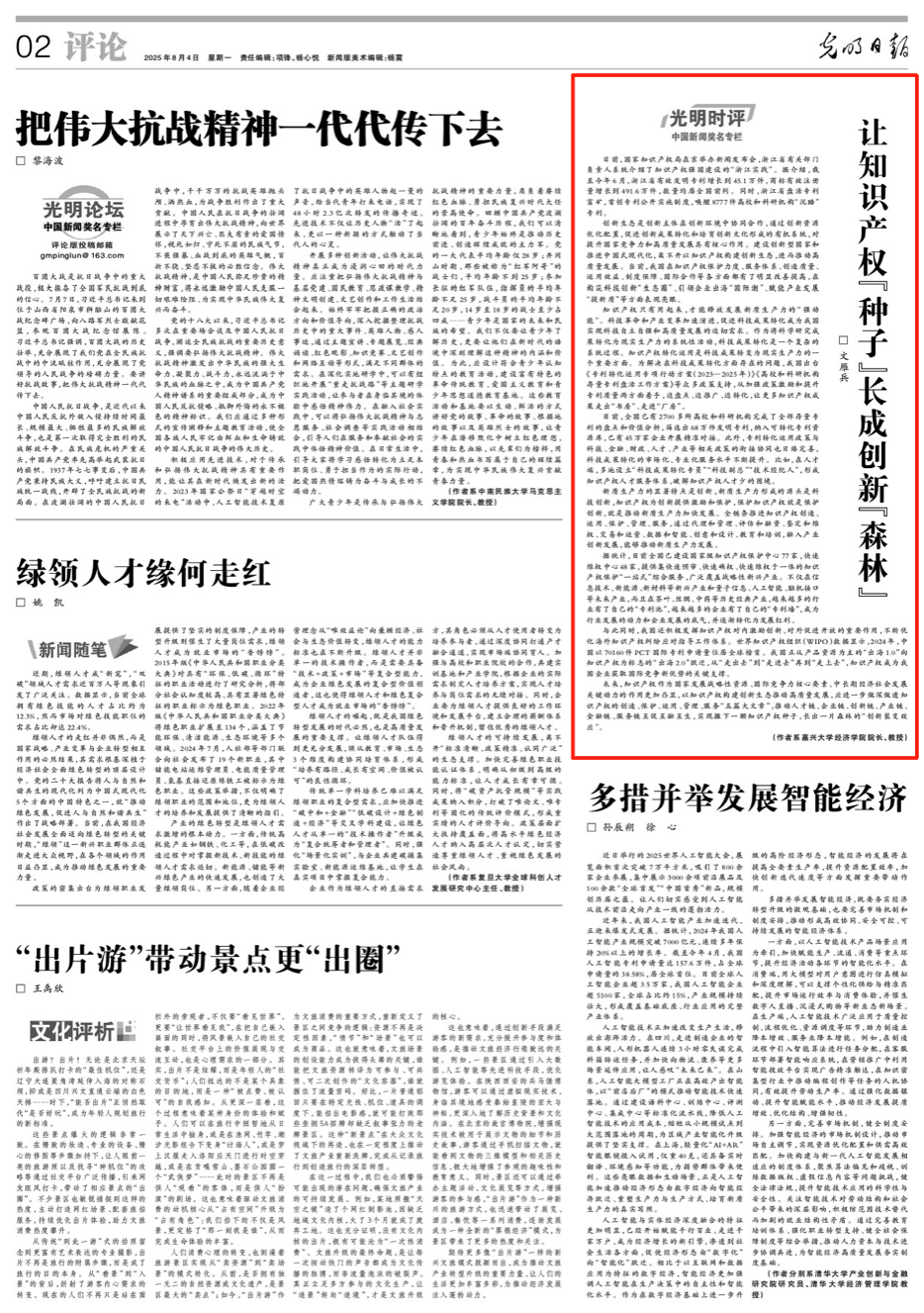 8月4日,我院文雁兵教授在《光明日报》发表文章《让知识产权“种子”长成创新“森林”》。