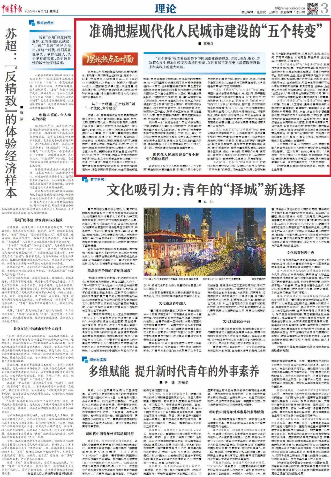 7月27日,我院文雁兵教授在《中国青年报》理论版发表文章《准确把握现代化人民城市建设的“五个转变”》。他指出,“五个转变”标志着新形势下中国城市建设的理念、方式、动力、重心、方法将会发生根本性转变和系统性变革,在世界城市发展史上都将取得理论上和实践上的重大突破。