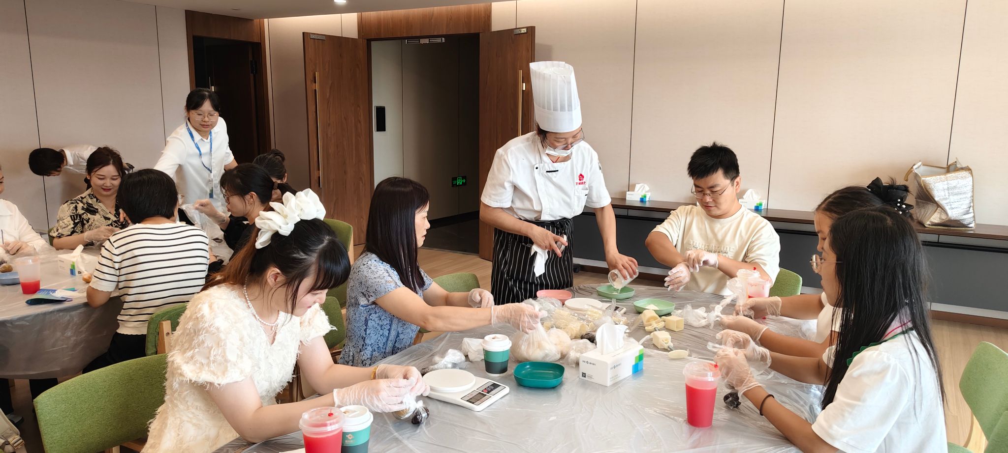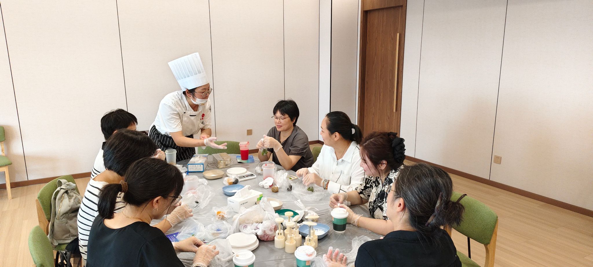活动现场,专业的糕点师傅为大家详细介绍冰皮月饼的制作方法和技巧,大家围坐在一起,全神贯注地认真聆听着。制作过程中,大家热情高涨,大展技艺,揉面、包馅、压模、成型,忙得不亦乐乎,大家互相分享各自作品,收获满满。