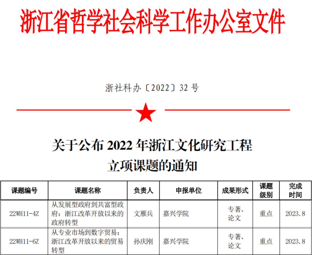 近日,浙江省哲学社会科学工作办公室发布了《关于公布2022年浙江文化研究工程立项课题的通知》。我院文雁兵教授主持的《从发展型政府到共富型政府:浙江改革开放以来的政府转型》、孙庆刚副教授主持的《从专业市场到数字贸易:浙江改革开放以来的贸易转型》两项课题获批2022年浙江文化研究工程重点课题立项。