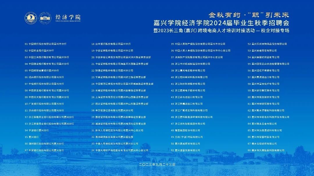 9月23日,“金秋有约 ‘职’引未来”——太阳成集团tyc122ccvip2024届秋季招聘会在梁林校区学术报告厅举行。这是学院面向2024届毕业生的第一场行业类专场招聘会(金融机构以及外贸类岗位),吸引了中国工商银行嘉兴分行、中国农业银行嘉兴分行、中信证券股份有限公司嘉兴分公司、中国人寿保险股份有限公司、浙江吉利控股集团、嘉兴国贸云商供应链管理有限公司等68家金融类及综合企业、进出口企业参与,发布用人需求500余个。