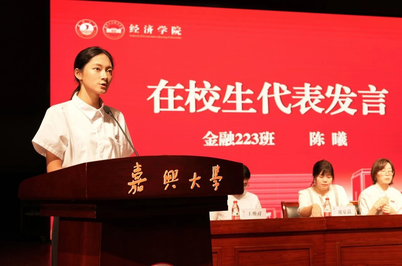 新生代表、经济241班沈雨琦在发言中表示宏伟古朴的龙星阁、尚德楼的上课铃声、校园里的书香气息都让她对未来的4年生活充满了期待和信心。作为红船旁的莘莘学子,将大力弘扬伟大建党精神和红船精神,认真做人、踏实学习,将校训和院训作为立身立学的准则,内化于心,外化于行,用青春践行“请党放心,强国有我”的铿锵誓言。