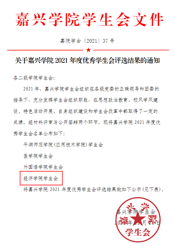 近日,在嘉兴学院2021年度优秀学生会评选中,经材料评审与公开答辩两个环节,我院学生会被评为“嘉兴学院2021年度优秀学生会”。