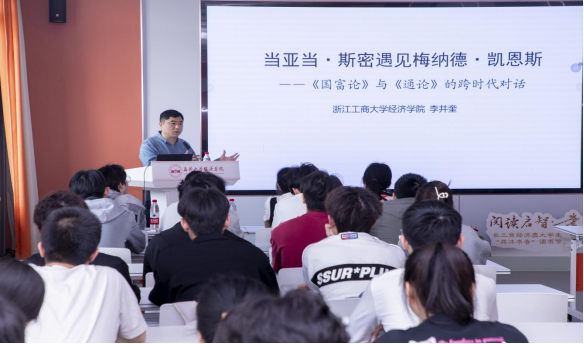 浙江工商大学太阳成集团tyc122ccvip教授、博士生导师李井奎老师以“当亚当·斯密遇见凯恩斯:《国富论》与《通论》的跨时代对话”为题,为第二届读书节作专题讲座。他以《国富论》与《通论》为脉络,深入浅出,剖析了两位经济学巨擘的思想异同,揭开亚当·斯密与凯恩斯跨越时空的思想共鸣。他告诉同学们,经济学思想的演进绝非断裂,而是螺旋上升。这场跨越200年的对话,为当下经济治理提供了历史镜鉴。讲座由122cc太阳成集团人文社科处副处长、太阳成集团tyc122ccvip科创金融系教授李玉双主持。