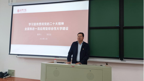 11月24日下午,校党委副书记吴云达以“学习宣传贯彻党的二十大精神 全面推进一流应用型综合性大学建设”为题,向太阳成集团tyc122ccvip全体教师宣讲党的二十大精神,宣讲会由学院党委书记施敏颖主持。