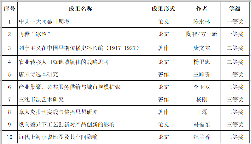 根据《嘉兴学院哲学社会科学优秀成果评奖办法》(见附件)有关要求,经个人申报、部门审核,并经通讯评审、评奖委员会评审、校学术委员会审定,《中共一大闭幕日期考》等十项成果为拟奖励成果,现予以公示,公示时间为10月8日至10月13日,公示期间如有异议,请按照嘉兴学院哲学社会科学优秀成果评奖办法》第九条“异议处理”有关规定如实反映。